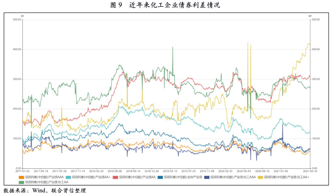 從信用利差來看,2021年上半年,化工行業(yè)AA級別企業(yè)利差窄幅震蕩,6月底利差較年初收窄22.97BP;AA+級別企業(yè)利差明顯走闊,6月底較年初大幅上行156.53BP,主要系發(fā)債規(guī)模較大的個別企業(yè)債券估值收益率上行所致;AAA級別企業(yè)6月底較年初收窄32.30BP。