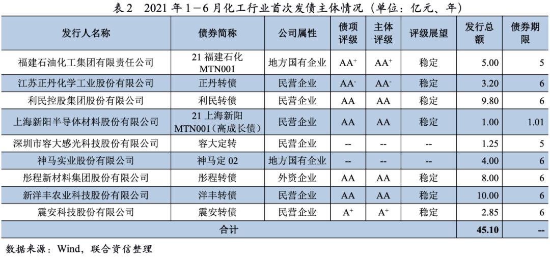 2021年上半年,化工行業(yè)首次發(fā)債主體以民營企業(yè)為主,可轉(zhuǎn)債為信用等級相對較低的企業(yè)拓寬了債券市場融資渠道。