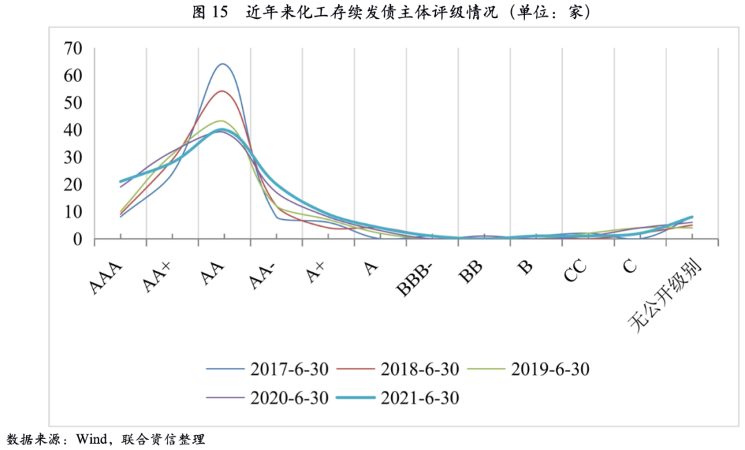 從化工行業(yè)有存續(xù)債券發(fā)行人信用等級來看,整體以AA為中樞近似呈正態(tài)分布,但隨著近年來信用債市場的發(fā)展,市場對企業(yè)信用區(qū)分度要求不斷提高,同時,企業(yè)自身信用資質(zhì)也在不斷變化,化工行業(yè)存續(xù)發(fā)行企業(yè)信用等級分布較此前逐漸平滑,AA級別數(shù)量呈現(xiàn)減少并向兩端移動的趨勢。