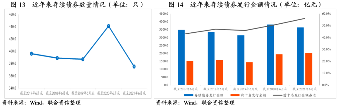 截至2021年6月底,化工行業(yè)存續(xù)債券規(guī)模為近年來同期相對高位,化工行業(yè)前十名存續(xù)債券金額及占比整體呈上升趨勢,債券市場資金向頭部企業(yè)集中。而從發(fā)行人信用資質(zhì)來看,行業(yè)內(nèi)企業(yè)信用等級以下調(diào)為主,化工行業(yè)存續(xù)債券發(fā)行人信用等級區(qū)分度有所提高。