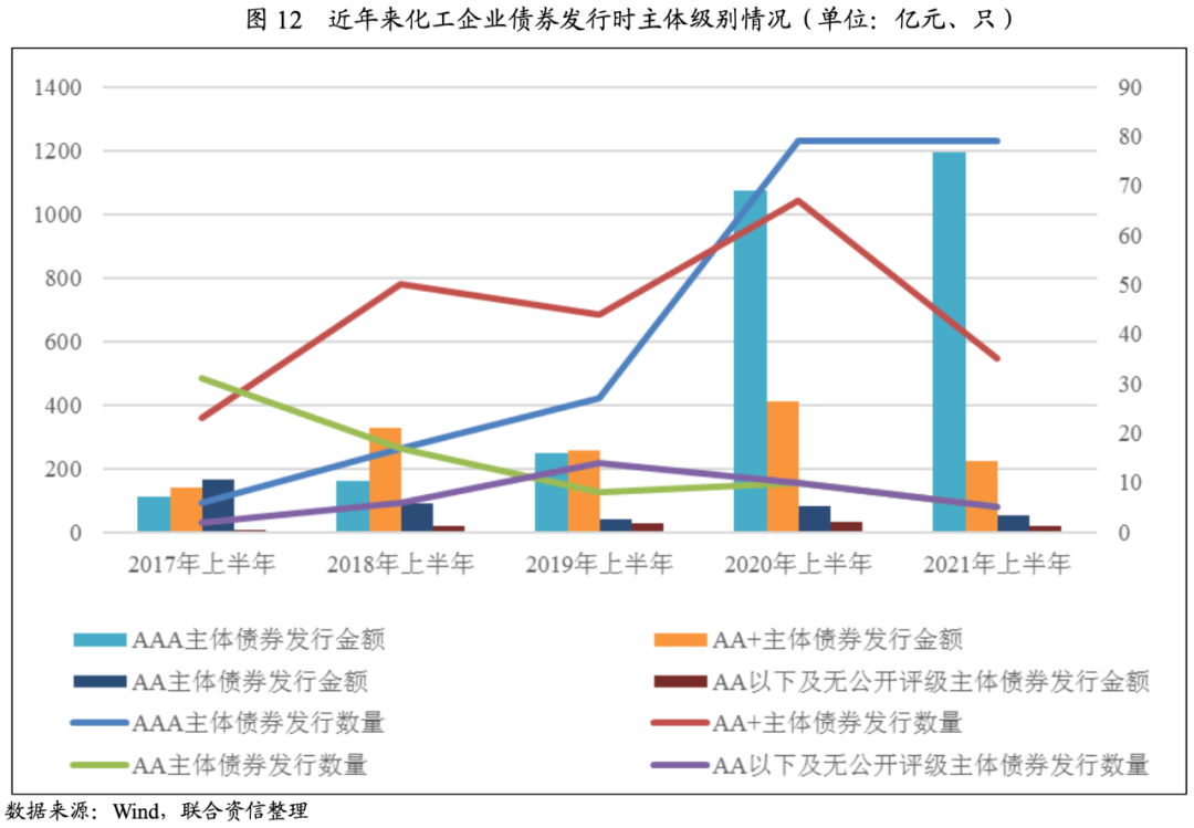 從相關債券發(fā)行時級別分布看,2021年上半年化工企業(yè)發(fā)行的124只信用債券發(fā)行時主體級別仍以AA+和AAA為主,AAA級別主體發(fā)行的信用債數(shù)量占比保持了近年來的逐年上升趨勢。截至2021年6月底,化工企業(yè)發(fā)行信用債券中,AAA級別主體信用債數(shù)量占比為63.71%,同比提高16.12個百分點,較非AAA主體債券發(fā)行數(shù)量優(yōu)勢進一步擴大。AA及以下級別、無公開評級的主體債券發(fā)行數(shù)量占比合計未超過10%。上述情況反映了即使在當前大多數(shù)化工企業(yè)效益明顯好轉(zhuǎn)的背景下,面對國內(nèi)和國際復雜多變的大環(huán)境,投資者對于高評級債項的偏好仍然未發(fā)生明顯變化。
