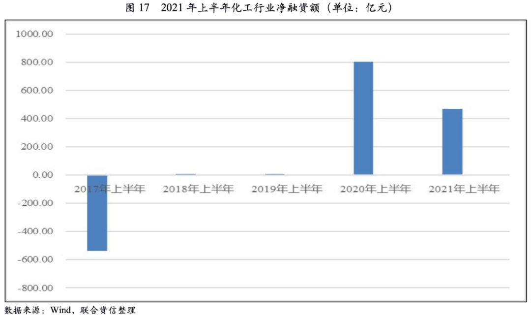 2021年上半年,化工行業(yè)凈融資額為470億元,同比下降41.47%,2021年上半年發(fā)行規(guī)模有所下降;但從近五年化工行業(yè)凈融資額來看,2020年以來化工行業(yè)形成新一輪融資高峰。