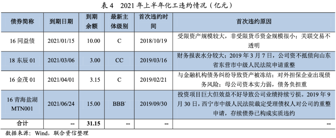 2021年上半年,化工行業(yè)無新增違約主體。新增到期違約債券主要系前期已違約主體無償付能力所致。2021年上半年,化工行業(yè)違約債券合計金額31.15億元,占上半年到期化工債券總額的3.04%,占六月末存續(xù)債券余額的0.87%,整體風險可控。