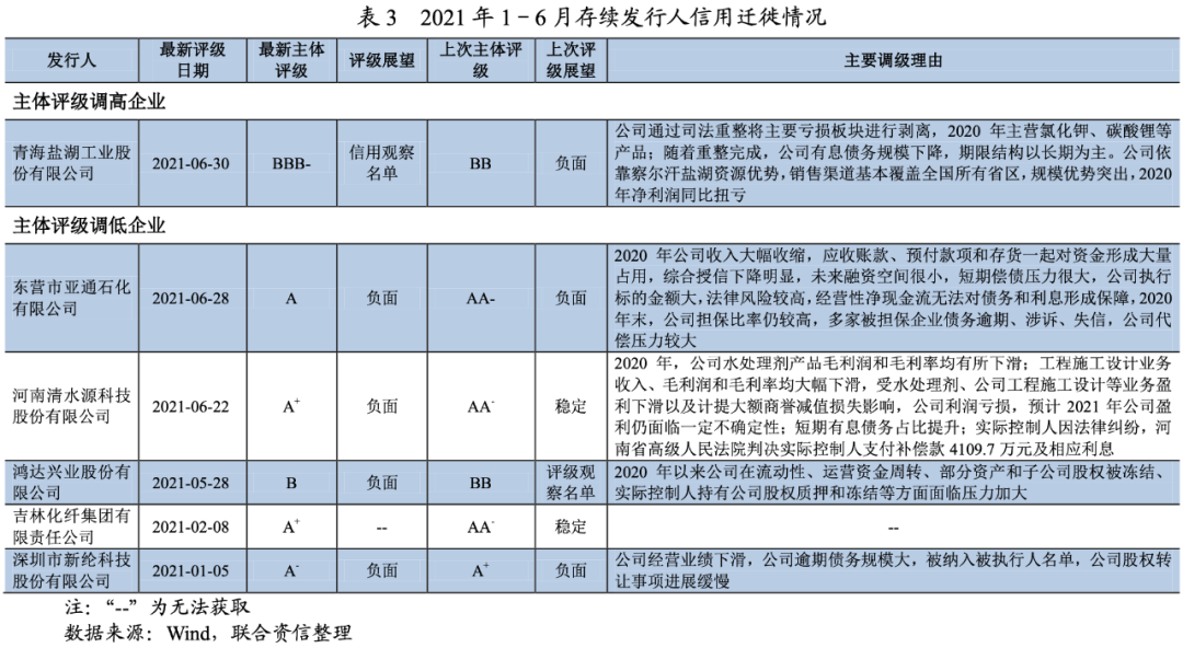 2021年1-6月,化工企業(yè)信用遷徙情況如下表所示,其中,評級上調(diào)的僅有青海鹽湖工業(yè)股份有限公司,主體評級由BB上調(diào)為BBB,評級上調(diào)主要基于其司法重整將主要虧損板塊剝離,財務狀況改善。評級下調(diào)的涉及5家,4家下調(diào)一個子級,1家下調(diào)兩個子級(深圳市新綸科技股份有限公司由A+下調(diào)為A-),評級下調(diào)因素主要涉及經(jīng)營業(yè)績下滑、流動性緊張、訴訟等因素。
