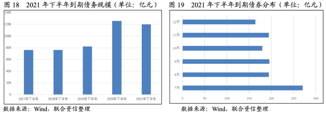 2021年下半年,化工行業(yè)債券到期規(guī)模為1198.39億元,同比下降4.72%,其中7月到期規(guī)模較大,為270.4億元,其余月份到期規(guī)模較為均衡。