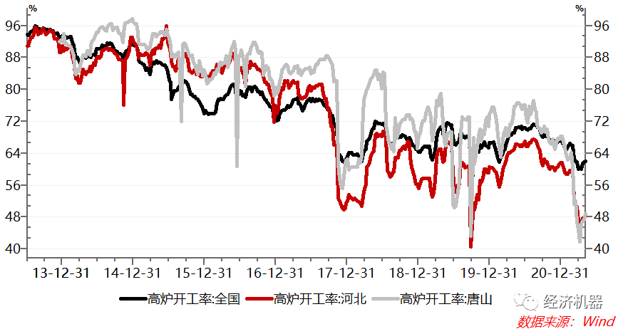 3)環保風暴。金山銀山不如綠水青山。建設綠色中國,是地方政府考核的硬杠杠和“高壓線”。一旦環保排名倒數,輕則主要負責人誡勉談話,重則下臺負責。相反,新時代淡化了對經濟增速的要求,不追求高增長成為一種“共識”。在環保硬約束、增長有彈性的情況下,各級地方政府將“環?!敝糜凇霸鲩L”之上,環保限產始終處于高壓狀態。比如,3月19日,唐山發布鋼企限產最新措施,全市全流程鋼鐵企業3月20日至12月31日減排比例達到30%-50%。目前河北和唐山高爐開工率僅有48%,遠低于全國62%的水平(圖6)。