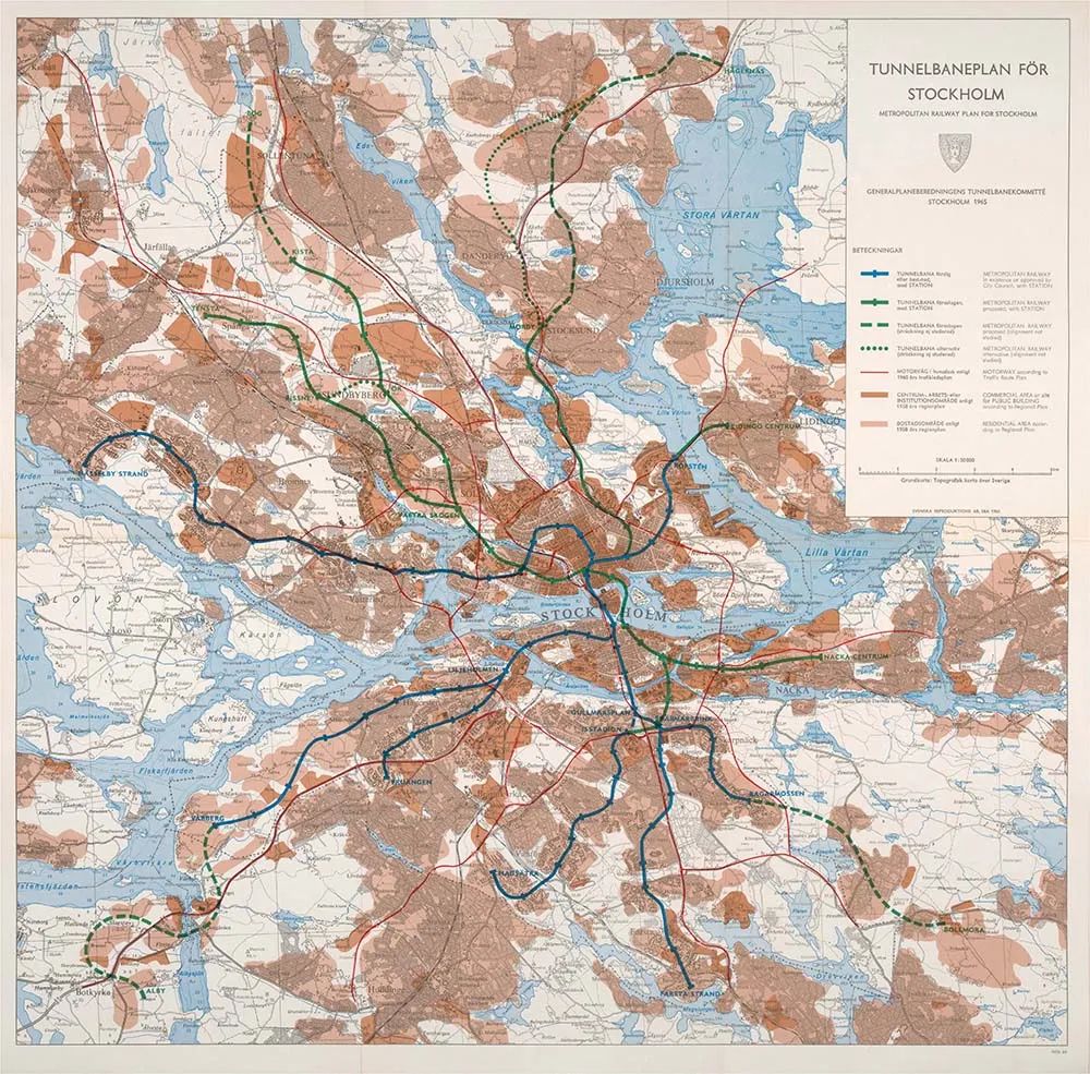▼ 1965年的斯德哥爾摩大都會軌道交通計劃(來源:Wikipedia)