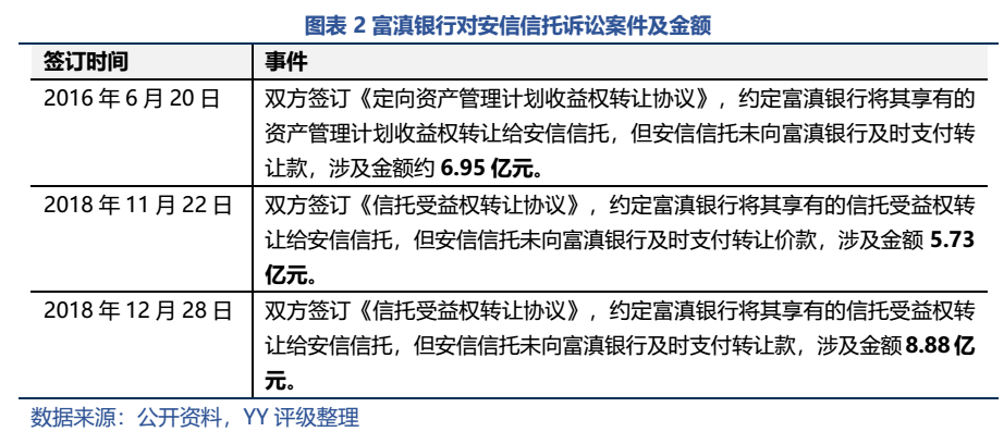 近些年安信信托一直負面輿情纏身,截至2020年末,安信信托已涉及幾十起訴訟,涉訴余額超過百億元,覆蓋銀行、地方金控和資管公司。富滇銀行的20多億能否被如數償還要被打上一個大大的問號。