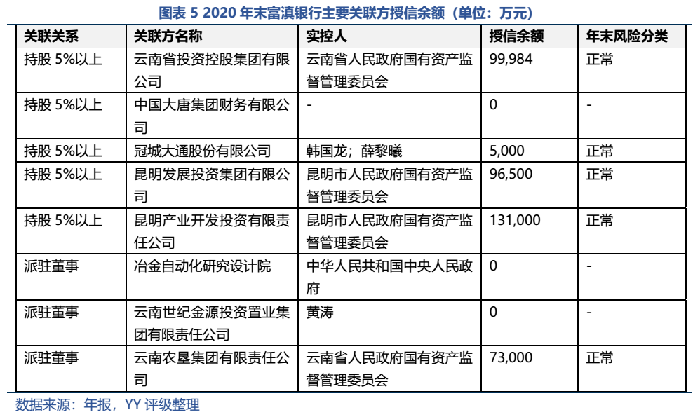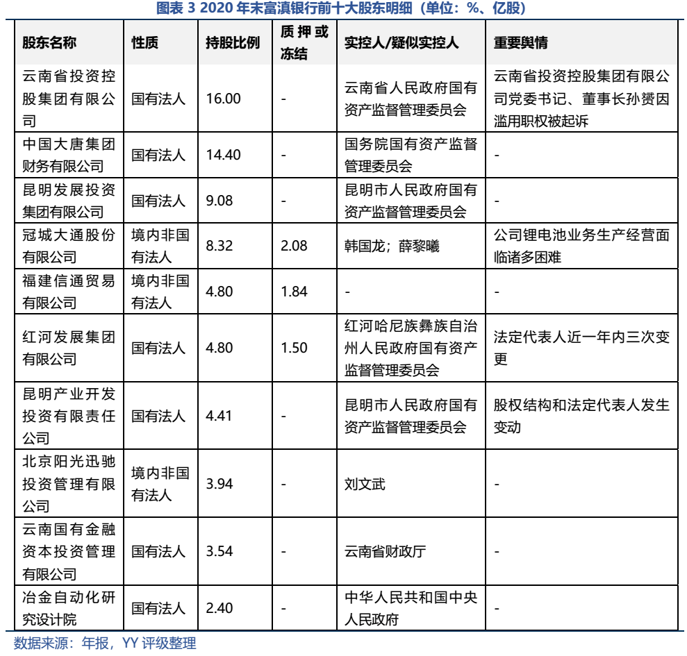 截至2020年末,富滇銀行前十大股東合計持股71.69%,其中國資持股比例達54.63%,國資背景濃厚。其中,云南省投資控股集團有限公司通過與云南國有金融資本投資管理有限公司、云南能投聯合外經股份有限公司(非前十大股東)構成關聯關系,合計持有富滇銀行19.70%的股份,為富滇銀行的最大股東。值得關注的是該公司黨委書記、董事長孫赟今年5月因濫用職權被起訴。