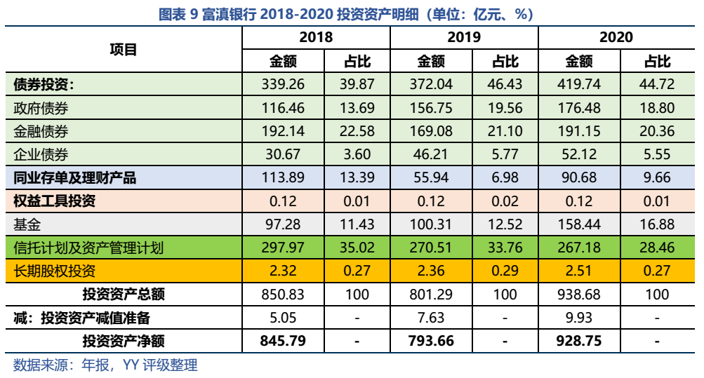 截至2020年末,富滇銀行投資資產凈額 928.75 億元,占資產總額的 30.27%。主要受監管作用影響,近年來富滇銀行加大了標準化資產的配置力度,非標資產有小幅壓縮。