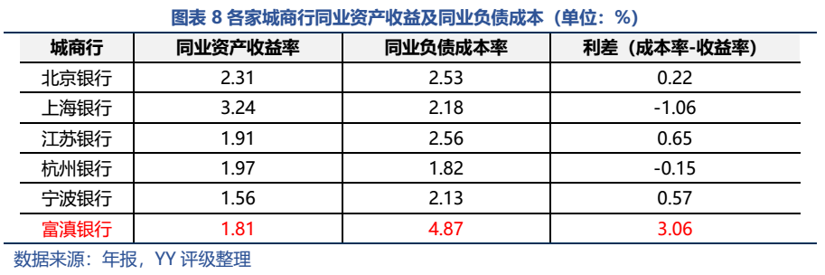 值得關注的是富滇銀行同業資產收益率與同業負債成本率之間嚴重不匹配。與幾家資質較好的城商行相比,同業資產收益率偏低,但同業負債的成本率卻過高,二者利差高達3.06%。