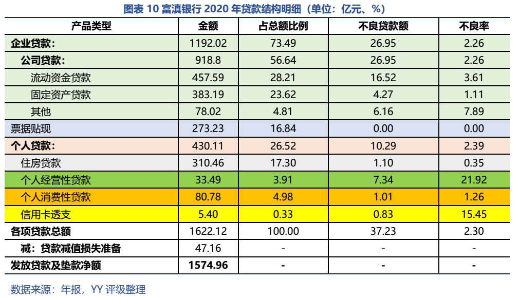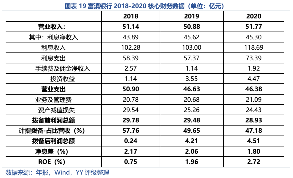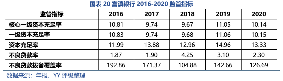 此外需要關注個人貸款業務。富滇銀行個人貸款以住房貸款及消費貸款為主;經營性貸款規模較小,但20年末其不良率高達21.92%。雖然就該類貸款性質而言,本身就較易出現不良,但如此之高的不良率還是反映出云南地區較弱的營商環境以及銀行可能存在的個人業務管理漏洞、風控不到位。