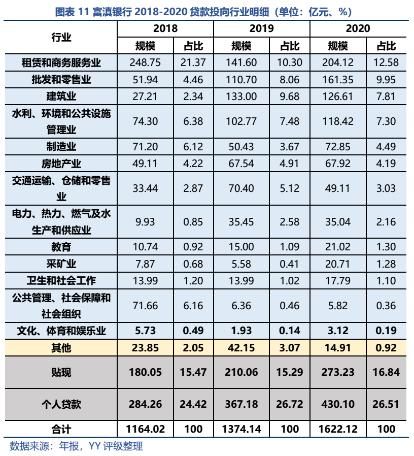 2020年末,富滇銀行對公貸款占比達73.49%。具體來看,流動資金貸款占比較高,占總額的28.21%,隨著15號文的落實推進,預計富滇銀行流貸規模將有一定下滑,屆時通過與21年年報中相關信息的比較,或許可以在一定程度上對富滇銀行原有流貸流向當地平臺的大致規模和比例進行模糊推測。