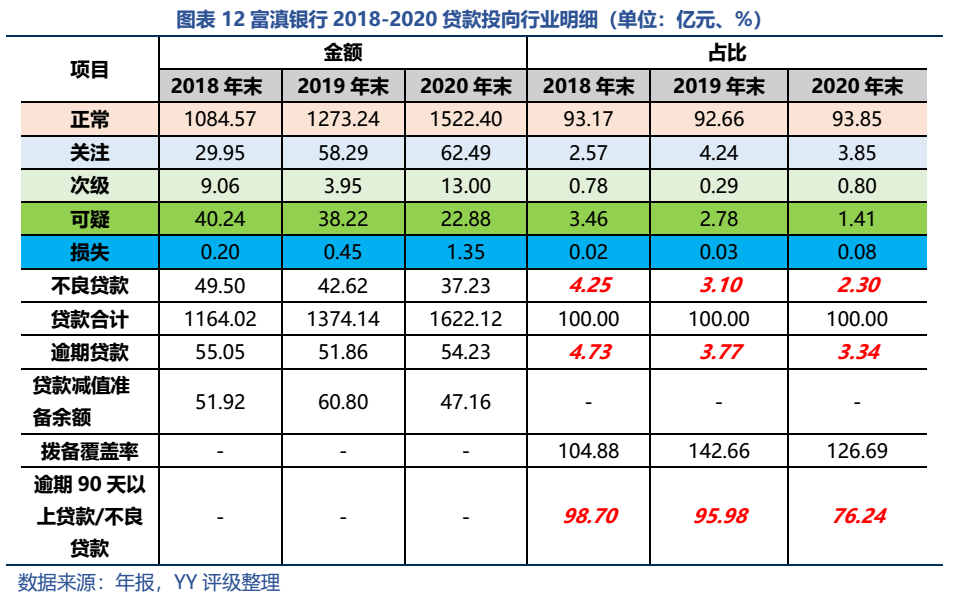 2020年末富滇銀行不良率為2.3%,仍高于行業平均水平(1.84%),但受益于較大的處置力度,其不良率和不良資產規模已經出現明顯下降,逾期貸款占總資產的比率及逾期90天以上比率也均有明顯下降。