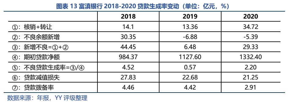 從動態角度來分析富滇銀行的貸款質量。受核銷及轉出不良貸款規模擴大及有效控制新增不良的影響,2018-2020年富滇銀行不良貸款生成率整體呈下降趨勢。雖然減值準備的收縮使得貸款撥備率有所下降,但以目前的減值準備規模足以覆蓋當年新增不良,至少從報表來看,富滇銀行的貸款質量確有轉好的趨勢,但是考慮區域城投類的風險仍在,趨勢難言好轉。