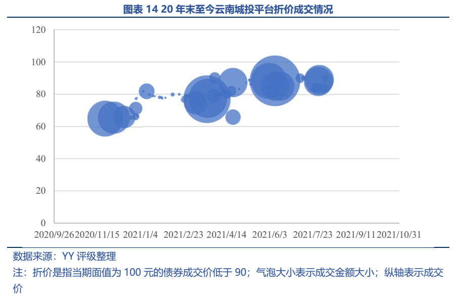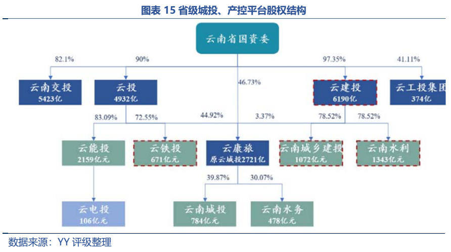 受地理、歷史等因素影響,云南省整體經濟財政實力較弱,而債務規模卻不算小,2020年末云南省發債平臺有息債務8457.61億元,YY Ratio為399.57%;其中昆明市發債平臺有息債務3989.14億元,YY Ratio為613.24%。省內平臺資質一般(省級平臺YY評級多集中在5、6附近),且關系較駁雜(城投、產控平臺間股權捆綁深,一榮俱榮一損俱損),市場存在一定規避情緒,隱含評級普遍較高(省級平臺YY隱含多在8左右)。