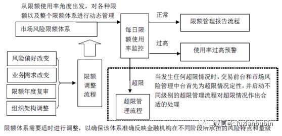 限額管理是對金融機構市場風險進行有效控制的一種重要手段,市場風險限額管理體系主要包括交易組合定義、限額結構和限額指標設定與審批、限額監控與報告、限額調整、超限額管理等。限額可以分配到不同地區、業務單元或業務人員,還可以按資產組合、金融工具和風險類別進行分解,具體管理流程如下圖: