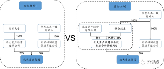 時(shí)間回到2003年,方正集團(tuán)改制拉開(kāi)序幕。在2003年的12月份,方正集團(tuán)確定北大資產(chǎn)經(jīng)營(yíng)有限公司(后文以“北大資產(chǎn)”代替)持有35%的股權(quán)(出資5250萬(wàn)元),北京招潤(rùn)、成都華鼎和深圳康隆分別出資4500萬(wàn)元、2700萬(wàn)元和2550萬(wàn)元,股權(quán)占比為30%、18%和17%。這一股權(quán)架構(gòu)曾短暫的出現(xiàn)在當(dāng)年北大方正集團(tuán)的改制過(guò)程中,其中北大資產(chǎn)的實(shí)控人為教育部,而后三家的實(shí)控人均為自然人李友。這樣的改制在遭到北大相關(guān)人士的反對(duì)之后,經(jīng)過(guò)一番拉鋸戰(zhàn),最終成都華鼎和深圳康隆退出了改制名單,到了2005年,改制確定了最終結(jié)果:北大資產(chǎn)持股70%,北京招潤(rùn)持股30%。2015年,方正集團(tuán)管理層李友等人被有關(guān)部門(mén)調(diào)查,其后管理層更迭,待到李友出獄后,再掀波瀾。最近,北大資產(chǎn)一紙?jiān)V狀:聲稱(chēng)當(dāng)年的改制無(wú)效,北大資產(chǎn)應(yīng)取得方正集團(tuán)100%的股權(quán)。該案最終結(jié)果如何,自有法律進(jìn)行判斷。但在這堪比電視劇的曲折情節(jié)中,方正集團(tuán)的實(shí)控人究竟是誰(shuí),竟難以給出一個(gè)確定的結(jié)論。