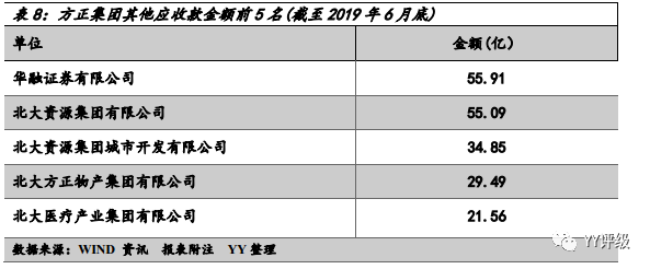 ②從其他應(yīng)收款項(xiàng)目來(lái)看,兩者又有顯著的差異。方正集團(tuán)的其他應(yīng)收款余額規(guī)模過(guò)高,從明細(xì)來(lái)看,2019年6月底披露的前五大應(yīng)收對(duì)象應(yīng)收金額達(dá)196億元,占比為33%。其中除華融證券外皆為下屬子公司,資金占用明顯。