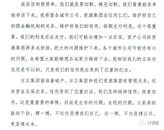 故從資產(chǎn)處置角度來(lái)分析,重點(diǎn)可看北大資源集團(tuán)。然最近又“偶遇吃瓜”,從其內(nèi)斗檄文中看出,北大資產(chǎn)接管資源集團(tuán),將資源集團(tuán)與方正集團(tuán)切割的目的以及十分明確,“大難臨頭各自飛”。