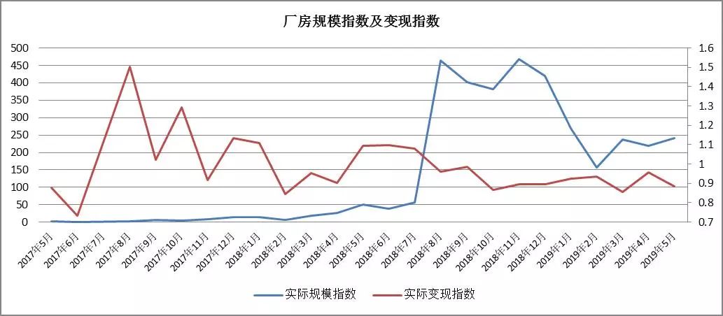 - 趨勢分析:工業(yè)用房成交量在 2018年8月與11月規(guī)模激增,之后開始下降,至2019年3月有所增加,4月、5月總體平穩(wěn);工業(yè)類房產(chǎn)的變現(xiàn)指數(shù)自2018年5月以來顯著持續(xù)下滑,仍有下滑趨勢。
