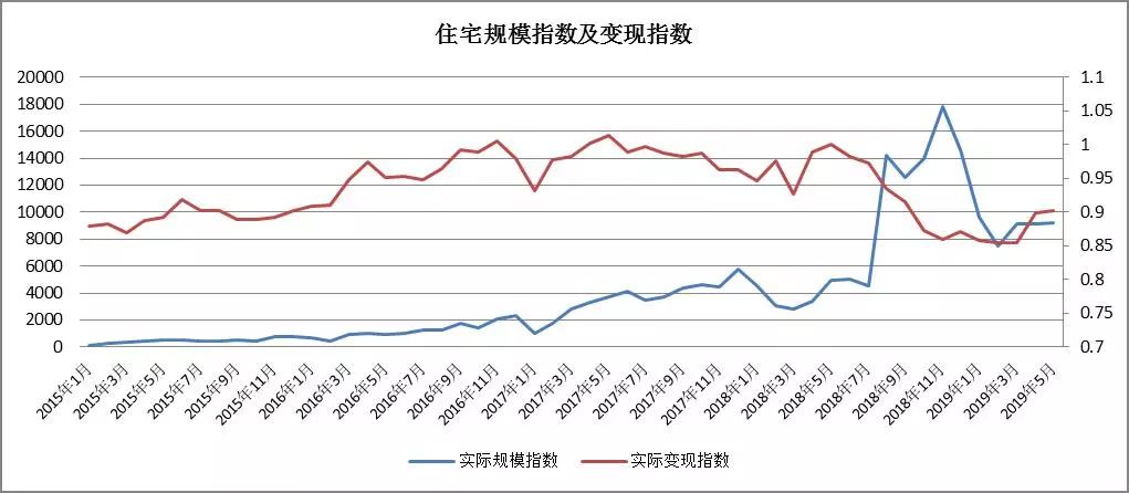 - 趨勢分析:住宅類房產(chǎn)的成交量自2015年1月以來至2018年8月呈指數(shù)型增長,此后成交量在高位震蕩了4個月后開始逐漸下滑;2015年1月至今,住宅類房產(chǎn)的變現(xiàn)能力呈現(xiàn)出先增后降的趨勢,2018年5月以后開始逐漸下滑,2019年5月的月度平均變現(xiàn)折扣率僅為90.19%。