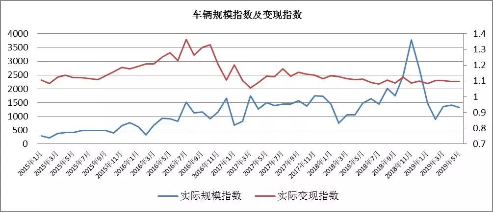 - 趨勢分析:車輛成交規(guī)模在2019年1月達到交易高峰,之后大幅下滑。機動車類資產(chǎn)變現(xiàn)能力非常強,絕大多數(shù)月份的平均變現(xiàn)折扣率都在110%以上,目前變現(xiàn)指數(shù)趨于穩(wěn)定,存在溢價空間,在105%上下。