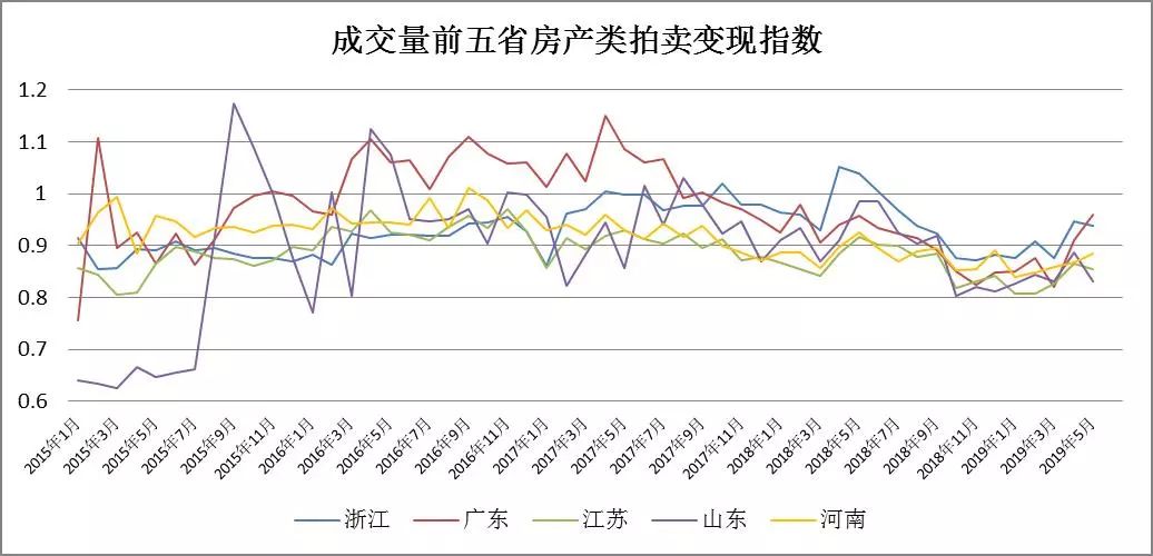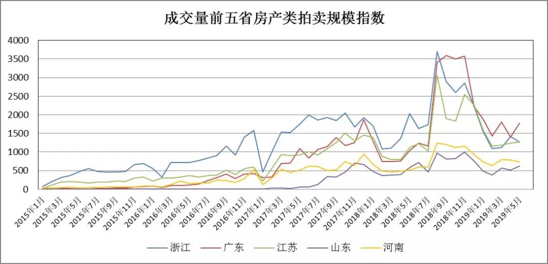 從各省房產(chǎn)類拍賣成交規(guī)模來看,整體上廣東、江蘇、浙江三省領跑全國,成交量峰值均在單月3000筆以上,其中浙江省2018年8月成交3708筆,創(chuàng)下目前最大單月成交量。各省規(guī)模指數(shù)走勢與全國走勢基本一致。從2015年初到2017年底為快速增長期,其后經(jīng)歷了一次低谷,到2018年下半年開始沖擊新高,此后的走勢有所分化,浙江省、江蘇省、山東省經(jīng)歷了劇烈波動后開始下滑,廣東省、河南省則在高位持續(xù)半年后開始快速下滑,隨后趨于平穩(wěn)。
