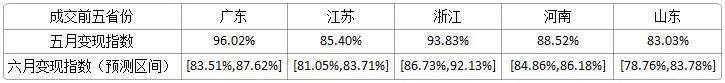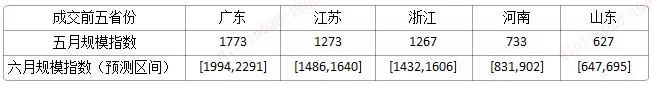 相較于五月份的規(guī)模指數(shù),預測成交前五省的規(guī)模指數(shù)在六月份呈上升趨勢,其中,山東省增速較緩。