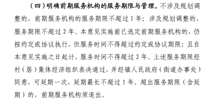 本部分內容從四個方面進行了明確:1、明晰前期工作內容;2、確定前期工作組織模式;3、規范前期服務機構的選?。?、明確前期服務機構的服務期限與管理。