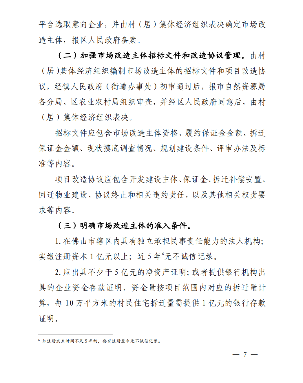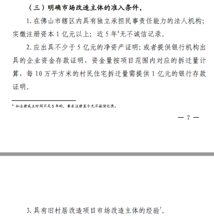 注意事項:本部分內容包含內容較多,從市場改造主體的準入、選取、管理機制、退出機制等做了詳細規定,其中尤其需要注意的是市場改造主體的準入條件、退出機制等,后續如企業擬參與佛山區域舊村居改造項目的,需提前根據政策要求進行布局(如佛山市轄區成立能夠獨立承擔民事責任的法人機構,實繳注冊資本一億元以上等),另外,新政對退出機制做了較嚴格的規定,明確市場改造主體應當在2年內完成與項目范圍內80%以上土地房屋權利人簽訂拆遷補償安置協議,該退出機制的設定,將一定程度上影響企業的項目推進節奏和計劃。