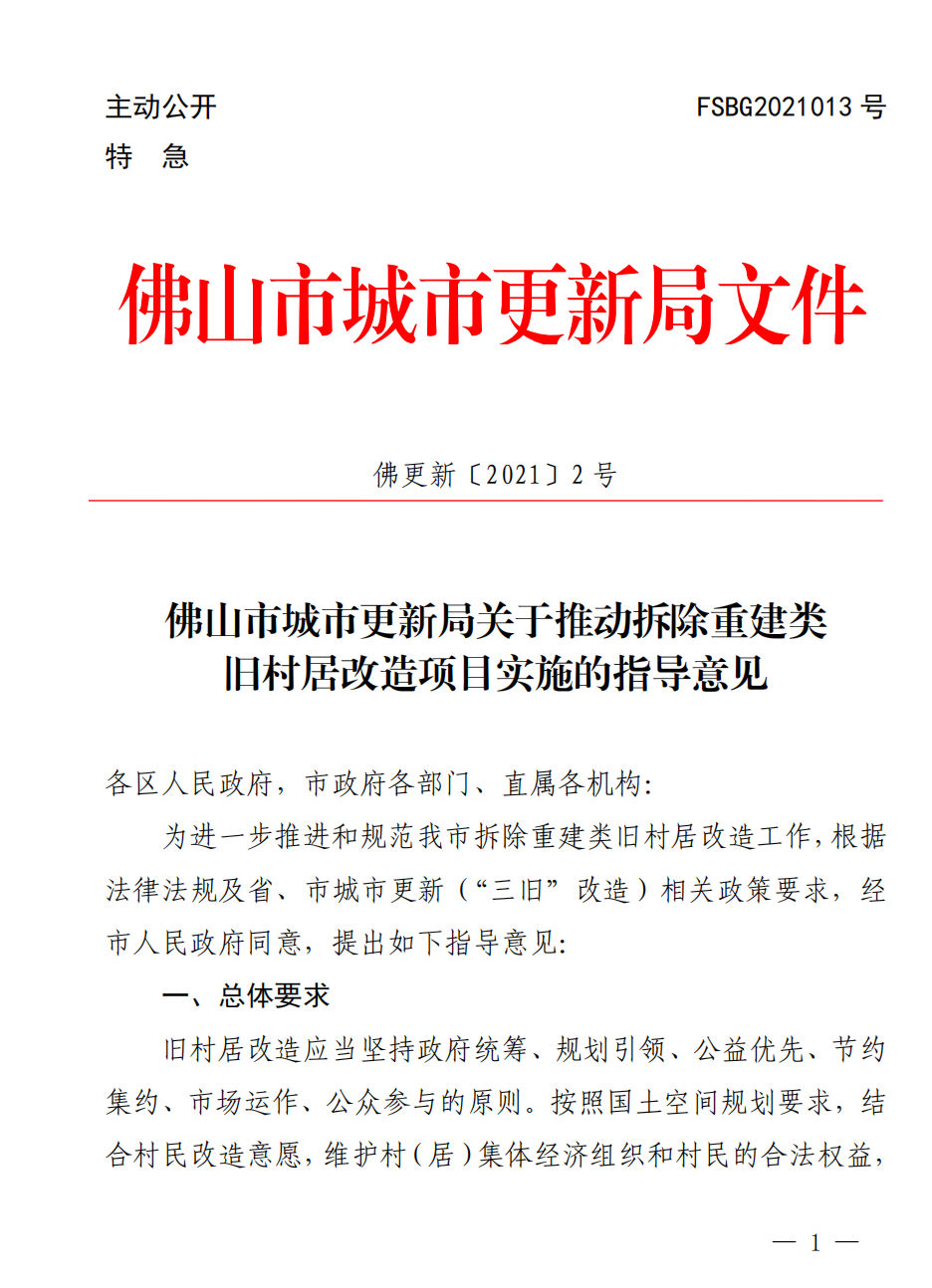 2021年3月2日,佛山市城市更新局主動公開并發布了《佛山市城市更新局關于推動拆除重建類舊村居改造項目實施的指導意見》(佛更新【2021】2號文)。