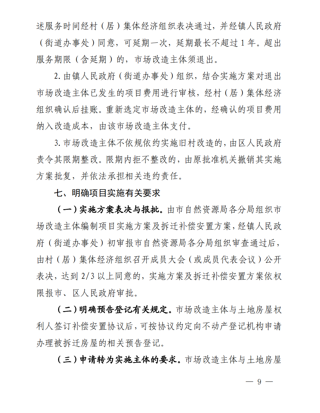本部分內容由五部分組成:1、實施方案表決與報批;2、明確預告登記有關規定;3、申請轉為實施主體的要求;4、完善項目監管協議的管理;5、允許先行供地。