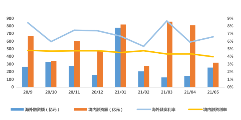 圖:近9個月房企境內(nèi)及海外債總額及利率走勢(億元,%)