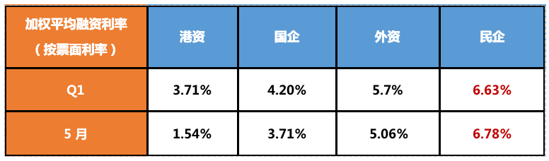 表:2021年Q1及5月各類房企平均融資利率(按票面利率)