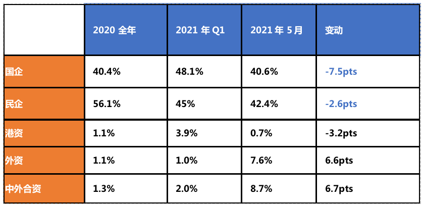 從融資集中度來看,民營房企發(fā)債融資占比進一步下降。一季度時由去年的56.1%降至45%,5月仍舊保持低位,僅有42.4%。