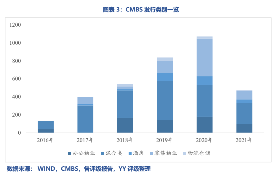 CMBS(商業(yè)地產(chǎn)抵押貸款支持證券)的特征為以商業(yè)地產(chǎn)為抵押、以相關商業(yè)地產(chǎn)未來收入(如租金、物業(yè)費等)為償還本息來源的資產(chǎn)支持證券產(chǎn)品。其中,商業(yè)地產(chǎn)往往包括一個或多個商場、寫字樓、酒店、公寓等商業(yè)地產(chǎn)的抵押貸款組合。而抵押貸款支持證券意味著相比REITS并不出表,往往通過信托計劃+專項計劃的雙SPV結構發(fā)行。另外,銀行間市場發(fā)行的稱為CMBN,現(xiàn)與CMBS大致類似,一般分類為CMBS/CMBN,下文統(tǒng)稱為CMBS。