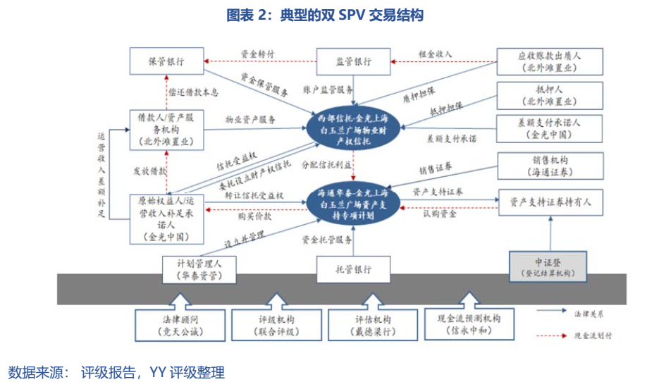 典型的雙SPV交易結構如下圖金光白玉蘭CMBS所示,雙SPV交易結構也是目前我國絕大多數(shù)CMBS的交易結構: