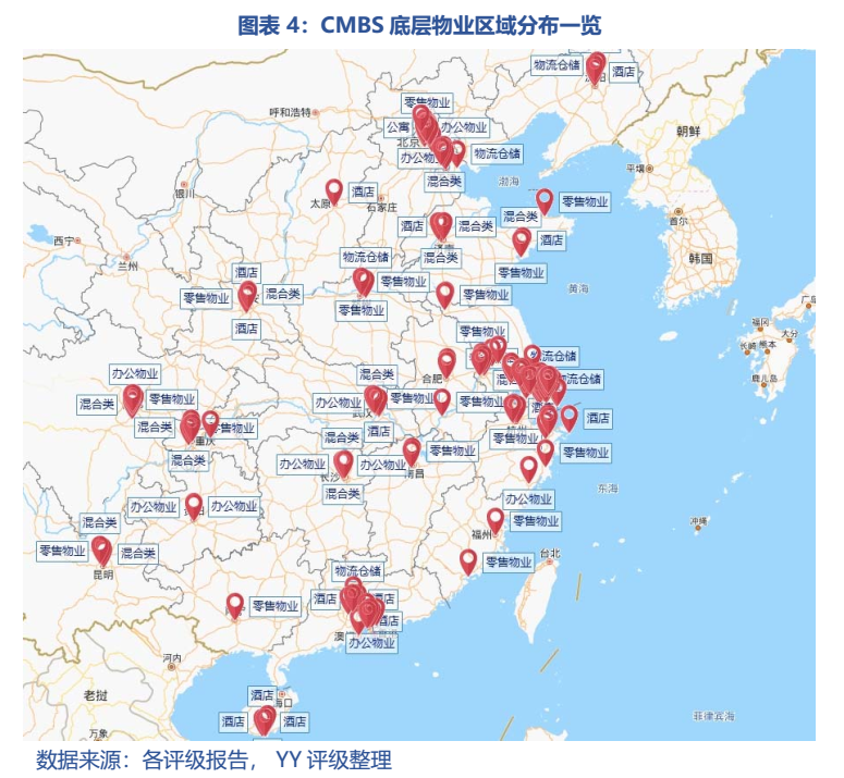 同時,將包含多個資產(chǎn)的CMBS拆開后(共282個物業(yè))為混合類68個、零售物業(yè)78個、辦公物業(yè)60個、酒店37個以及物流倉儲22個,辦公、零售或辦公購物綜合體的混合類仍為CMBS發(fā)行的主力。