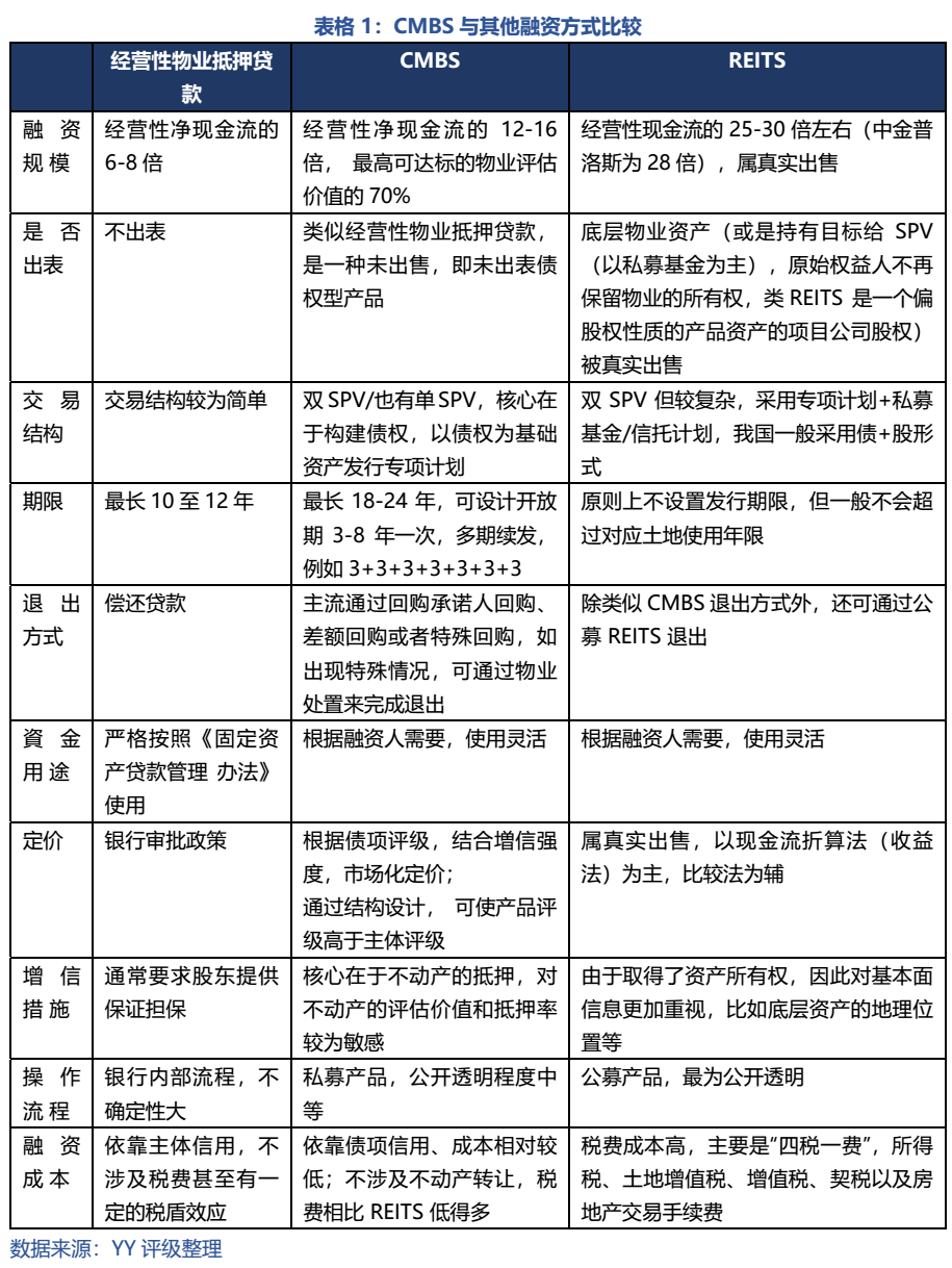 相比REITS的股性或經(jīng)營性抵押貸款的間接融資特性,CMBS有更強債性。具體體現(xiàn)為相較REITS不真實出售,而相較經(jīng)營性物業(yè)抵押貸款融資額較高、期限較長、資金使用限制相對較少。