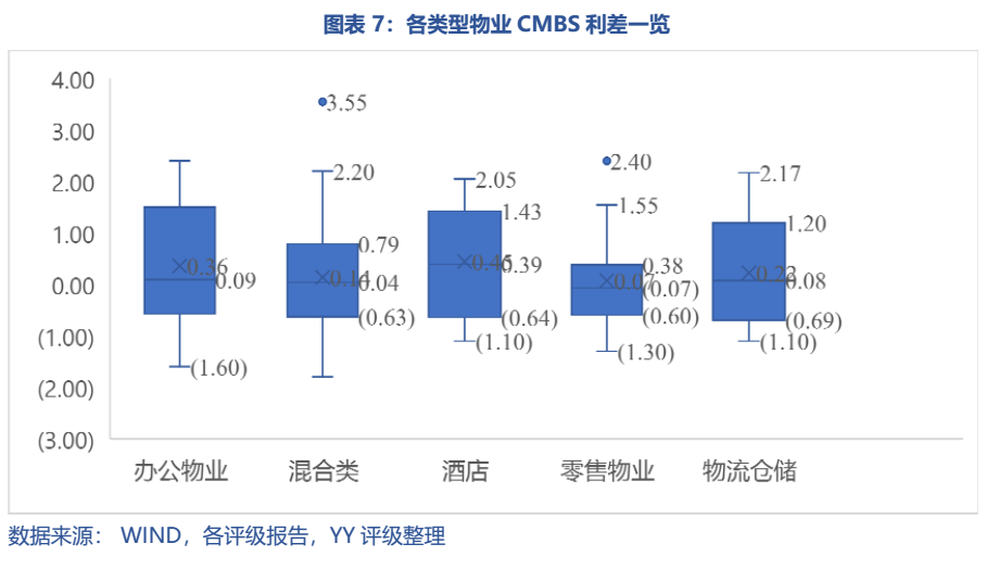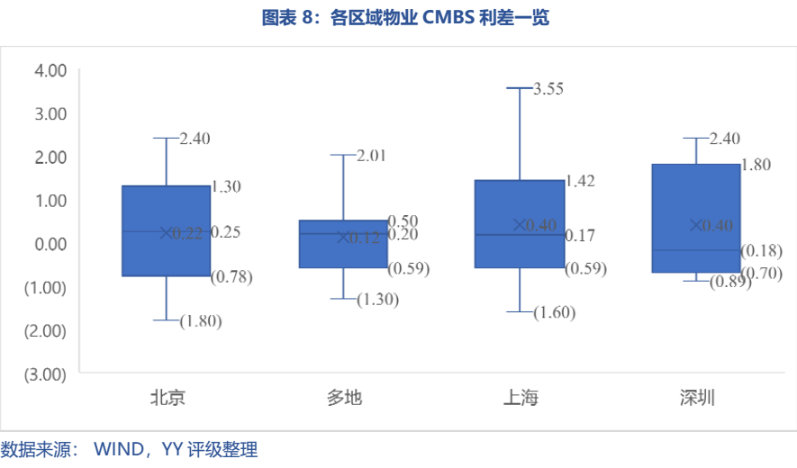 我們以A1優(yōu)先級的CMBS與主體信用利差為例,不同資產(chǎn)類型和不同城市的利差皆有不同。其中辦公物業(yè)、混合類、酒店、零售物業(yè)、物流倉儲的平均利差約為36、14、45、7、22 bp;而我們只看重點城市北京、上海、深圳的話(多地為多地多個資產(chǎn),平均12 bp)平均利差約為22、40、40bp。綜合而言,從利差角度,市場對核心城市(北上深)的辦公物業(yè)、酒店、物流倉儲資產(chǎn)認可程度較好,高于總體平均利差,而混合類和零售物業(yè)類資產(chǎn)雖然占比很高但方差也較大。