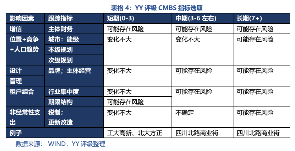 概括而言,表4的指標設計成維度定性跟蹤指標,即主體財務以反映增信風險、主體經(jīng)營(品牌)以反映設計和管理風險、各級城市規(guī)劃也反映位置+競爭+人口趨勢問題以及用行業(yè)分布、期限結構來跟蹤租戶組合風險,同時關注一些可能的非經(jīng)常性支出問題,如稅制改革(房地產(chǎn)稅)和更新改造需求(五角場萬達為10年左右后改造)。