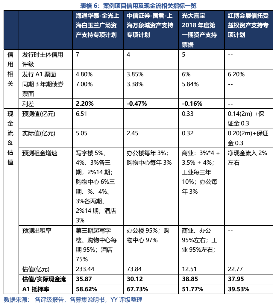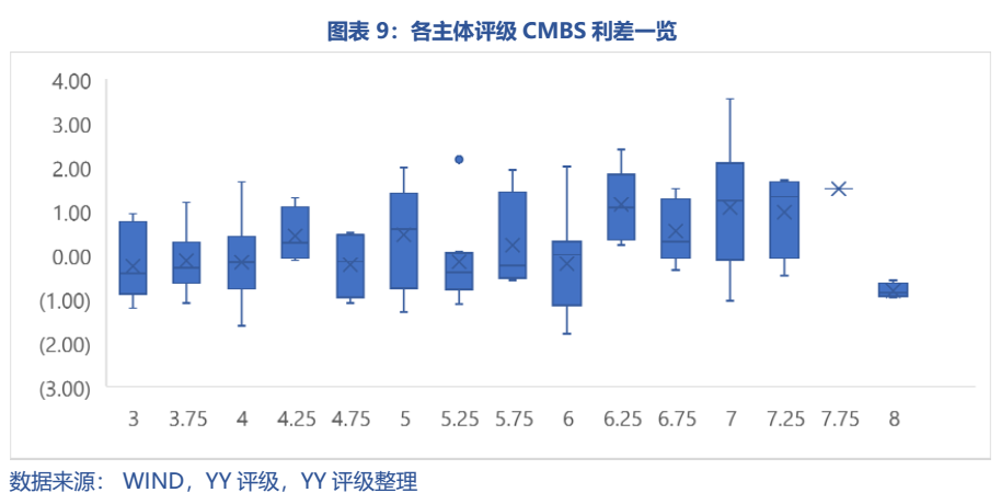 整體而言,取CMBS實際發(fā)行主體相近時間發(fā)行的3年期左右公司債或中期發(fā)行票面利率 – CMBS發(fā)行票面利率所得利差,體現(xiàn)CMBS的抵押和增信措施對債項的增信效果(或至少一級投資者認可的增信效果),一般而言>0的程度越高表示資產(chǎn)的增信程度越好。
