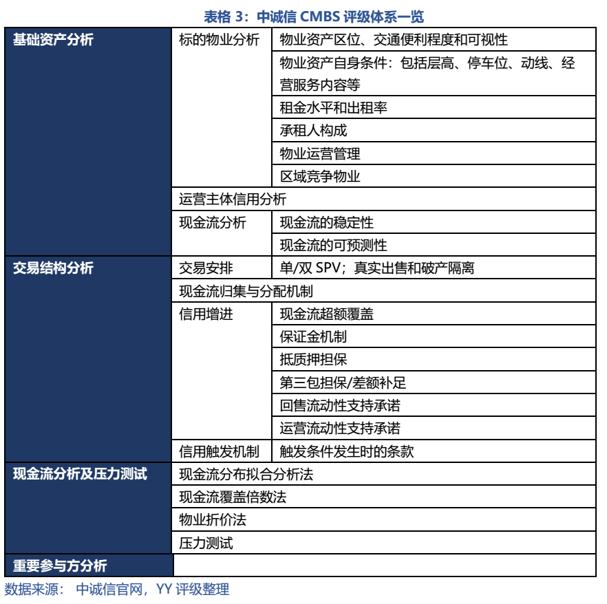 中誠信的商業(yè)物業(yè)抵押貸款結構化產(chǎn)品評級體系如表3所示,大致分為基礎資產(chǎn)分析、交易結構分析、現(xiàn)金流分析及壓力測試以及重要參與方分析上。