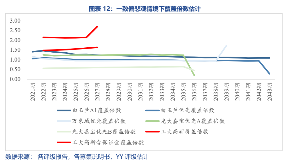 如圖14可見,在租金和出租率都偏悲觀(樂觀不消說除最后一期外都是足額的)的情況下,白玉蘭對A1級本息覆蓋倍數(shù)也一直保持在1以上,2027年開始對優(yōu)先A2級利息覆蓋不足,但也在0.95以上,但無法保障A2級本金償還;萬象城只有一層優(yōu)先級,悲觀預期下2024年開始優(yōu)先級本息覆蓋倍數(shù)小于1,但也一直處于0.9以上;光大嘉寶對優(yōu)先A級保障程度較好,但對優(yōu)先B級幾乎肯定無法覆蓋本息,必然依賴主體信用;工大高新在考慮不考慮保證金的情況下覆蓋倍數(shù)都較好,考慮保證金的情況下覆蓋倍數(shù)更是達到了2左右。