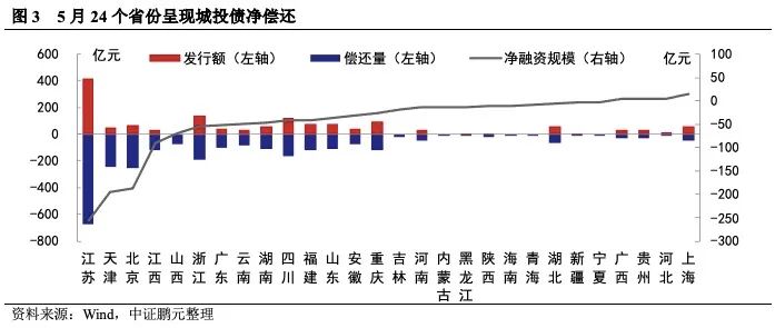 三、大部分省份城投呈現凈償還,以江蘇、天津、北京凈償還規模最大