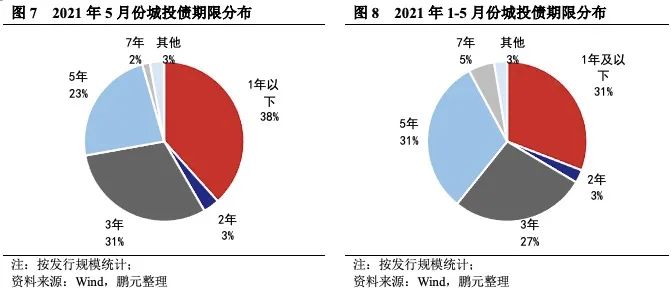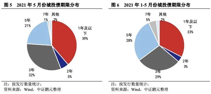 5月份城投債平均發行期限為2.78年,較4月份的3.64年縮短24%。發行期限縮短說明債券市場偏謹慎,風險偏好減弱。就發行數量來看,5月份發行的城投債中,3年期城投債發行67只,占比32%,發行規模462.04億元,占比31%;5年期城投債發行44只,占比21%,發行規模354.20億元,占比23%;一年以內短期限期品種發行81只,發行規模580.20億元,占比分別為39%、38%。綜合1-5月情況來看,3年期、5年期和一年以內城投債發行數量占比分別為29%、28%、33%,發行規模占比分別為27%、31%、31%。