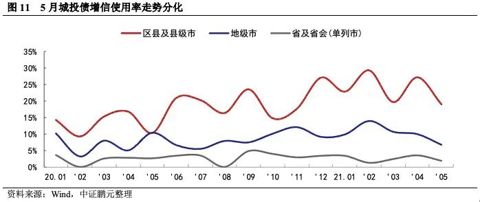 城投債增信使用率環比下降,高級別平臺融資環境相對較好。5月份,城投債總體增信使用率為11.0%,較4月份環比下降5.7個百分點。就不同行政級別的主體來看,5月份各個級別平臺的增信使用率不同程度的下降,以區縣級平臺的增信使用率較上月下降較大,由上月下降8.2個百分點至本月的18.95%。從當前數據可見,城投債一級市場的分化現象加重,高級別平臺融資環境相對更好。