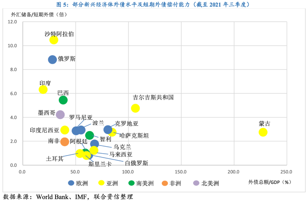雖然美聯(lián)儲(chǔ)本輪加息預(yù)計(jì)較沃爾克時(shí)代更為溫和,但在后疫情時(shí)代疊加俄烏戰(zhàn)爭(zhēng)爆發(fā)的背景下,部分新興經(jīng)濟(jì)體的經(jīng)濟(jì)、金融結(jié)構(gòu)缺陷將愈加明顯,導(dǎo)致其抵御外部風(fēng)險(xiǎn)沖擊的能力較差,因此本輪美聯(lián)儲(chǔ)加息或放大新興經(jīng)濟(jì)體的脆弱性。一方面,疫情后新興經(jīng)濟(jì)體的外債壓力不斷走高,尤其是以蒙古、吉爾吉斯斯坦、哈薩克斯坦等為代表的“高負(fù)債窮國(guó)”,由于本國(guó)融資能力有限以及外匯儲(chǔ)備嚴(yán)重匱乏,轉(zhuǎn)而通過舉借外債的方式補(bǔ)充資金,導(dǎo)致疫情后外債壓力大幅走高,三國(guó)外債水平均超過80%。本輪美聯(lián)儲(chǔ)或在2022年-2024年間累計(jì)加息10次,上調(diào)超過200個(gè)BP,直接加重這些“高負(fù)債窮國(guó)”的外債再融資壓力。從外匯儲(chǔ)備對(duì)短期外債的保障程度來看,截至2021年三季度,斯里蘭卡和白俄羅斯的外匯儲(chǔ)備對(duì)短期外債的保障程度僅約80%,土耳其和阿根廷的外匯儲(chǔ)備僅足夠支付其短期外債,未來外債償付面臨較大的不確定性。另一方面,美聯(lián)儲(chǔ)加息后帶動(dòng)國(guó)際資本回流美國(guó),在推高美元幣值的同時(shí)加劇新興經(jīng)濟(jì)體的匯率風(fēng)險(xiǎn),尤其是本幣較為脆弱的土耳其以及處于歐美制裁中的白俄羅斯,這兩國(guó)本幣兌美元匯率分別較年初下跌10.1%和9.8%,進(jìn)一步加大了新興經(jīng)濟(jì)體的外部風(fēng)險(xiǎn)敞口。