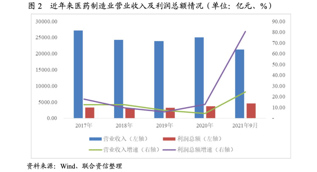 2020年,受新冠肺炎疫情影響,各層級醫(yī)療機構(gòu)日常診療活動減少,藥品終端銷售市場規(guī)模近年來首次出現(xiàn)負增長,但隨著人均可支配收入增長、人口老齡化趨勢逐年加重以及醫(yī)保收入和參保人數(shù)增加,中國醫(yī)藥需求仍保持穩(wěn)健。2021年以來,醫(yī)藥行業(yè)盈利水平逐漸從新冠肺炎疫情的影響中恢復(fù),醫(yī)藥制造業(yè)企業(yè)營業(yè)收入和利潤總額均大幅增長;同時持續(xù)加強創(chuàng)新研發(fā)投入,行業(yè)內(nèi)企業(yè)獲現(xiàn)能力持續(xù)提升,杠桿水平處于合理水平。